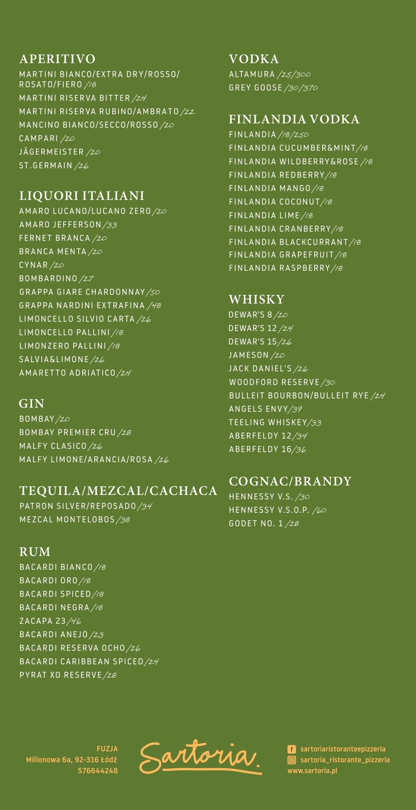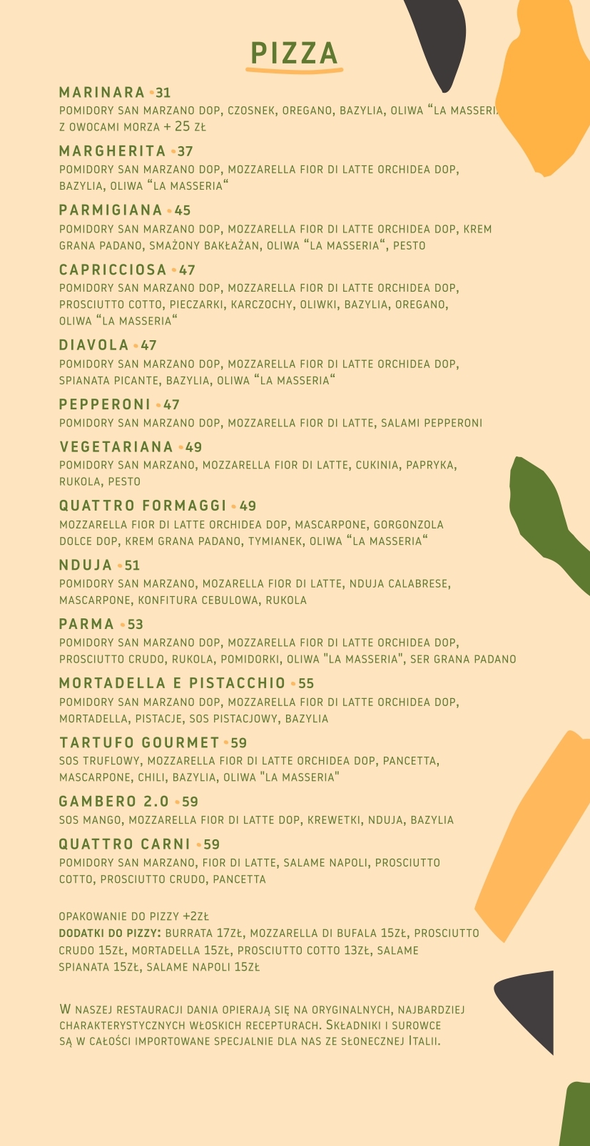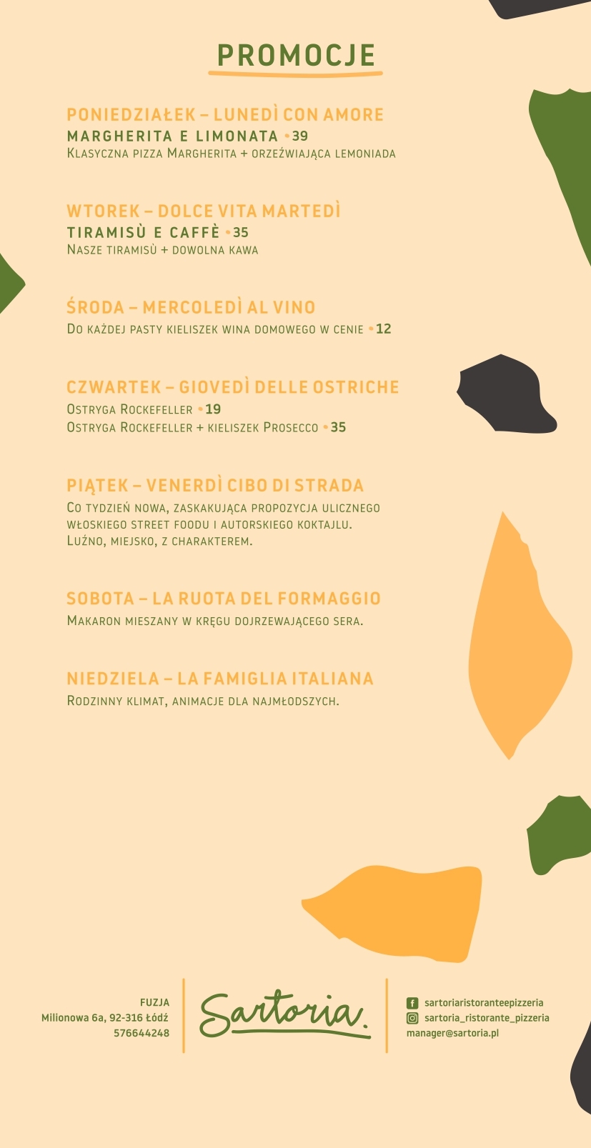 Ręcznie robiony makaron to prawdziwa duma naszej kuchni – spróbuj spaghetti alla carbonara, tagliatelle z krewetkami i ravioli z kaczką. Fani pizzy neapolitańskiej zakochają się w naszej ofercie. Quattro Formagi, Nduja, Tartufo Gpurtmet czy klasyczna Parma. Brzmi pysznie, prawda? Zapraszamy do restauracji Sartoria!