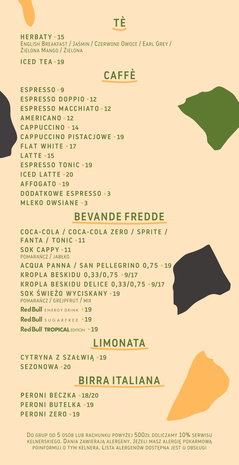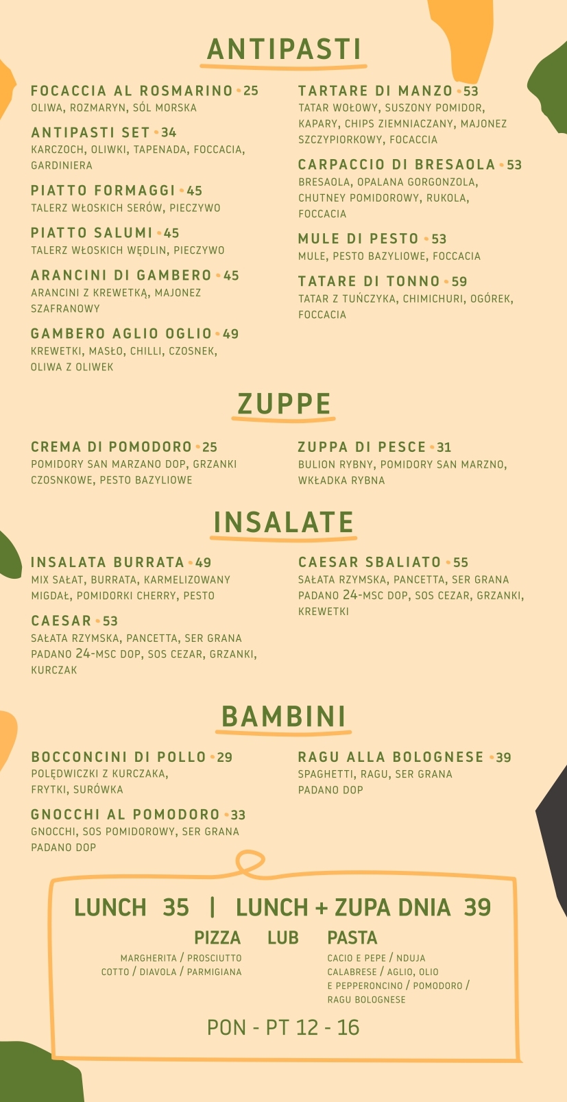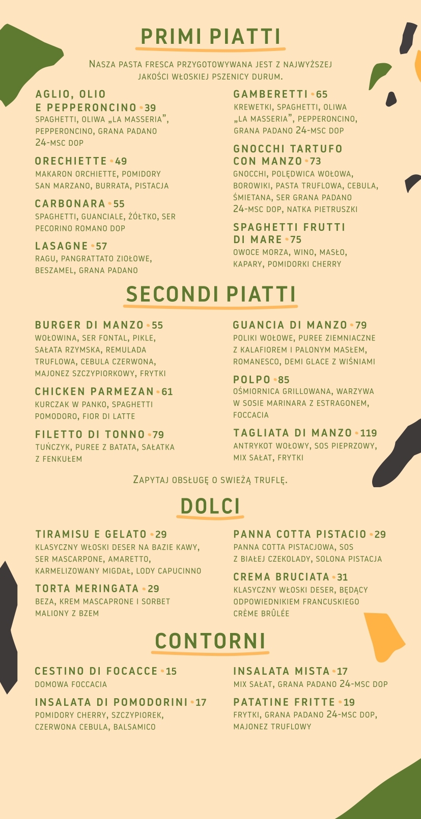 Nasze menu to podróż przez smaki słonecznej Italii – znajdziesz tu zarówno klasyczne, jak i nowoczesne interpretacje włoskich dań. Rozpocznij ucztę od wyboru lekkich antipasti, takich jak bruschetta z truflami, omułki na białym winie czy krewetki Con Nduja. W sekcji zup czeka na Ciebie krem z pomidorów oraz wspaniały bulion rybny, przygotowywany na bazie tuńczyka, ośmiornicy i małż.